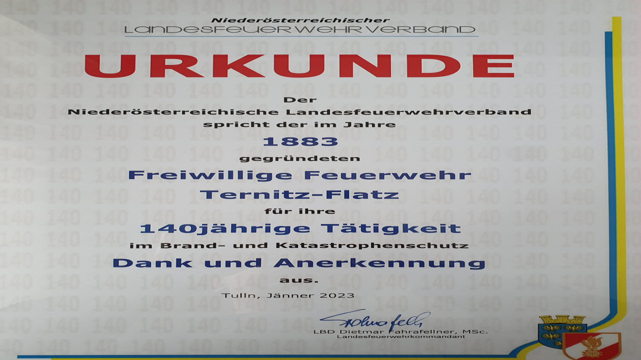 Von unserem Bezirksfeuerwehrkommandanten, LFR Josef Huber, bekamen wir die Urkunde für das 140-jährige Jubiläum unserer Feuerwehr überreicht, welche wir mit Stolz entgegennahmen.