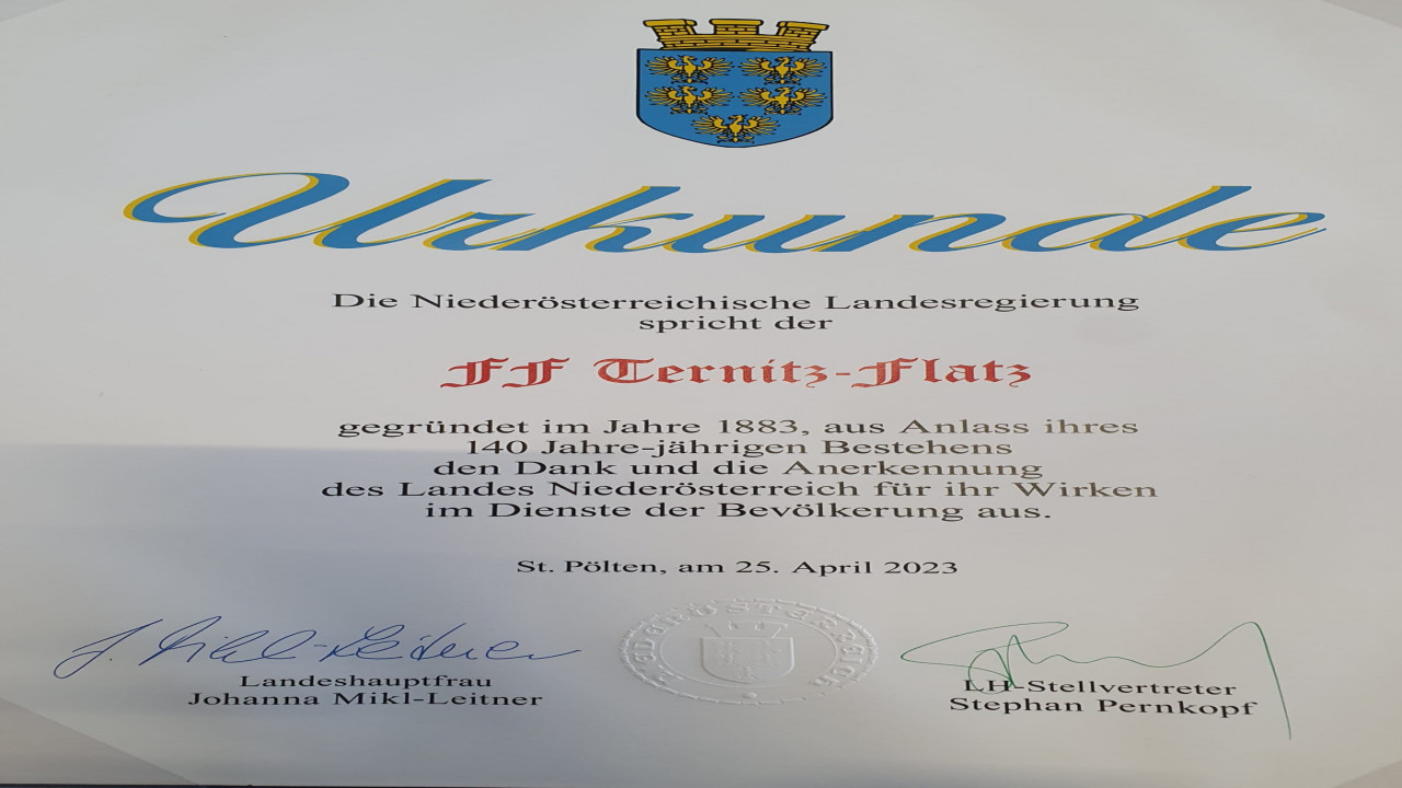100, 125, 140, 150, 160 jähriges Bestehen eine Urkunde vom Land Niederösterreich verliehen.