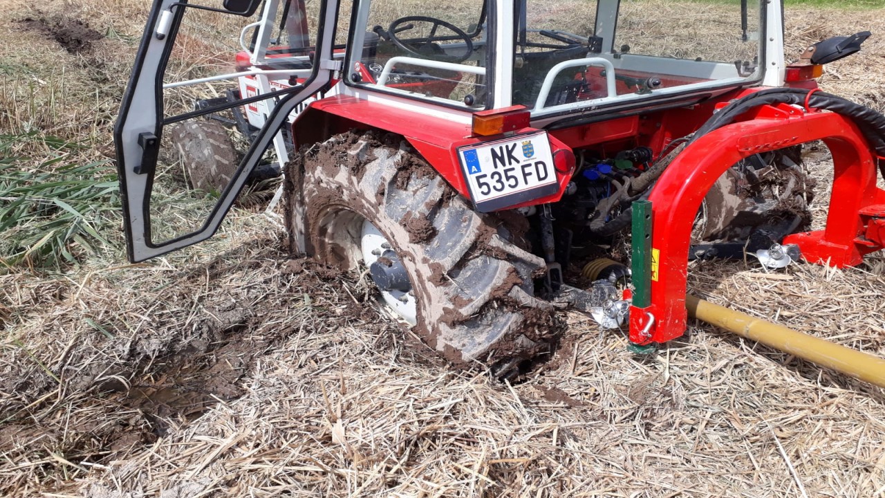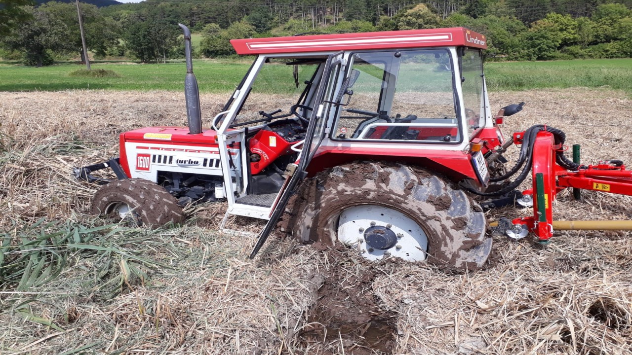 Beim Eintreffen der Feuerwehr zeigte sich, dass ein Traktor im Feld bis zur Hälfte der Hinterreifen im Schlamm feststeckte. Der Traktor wurde mit Hilfe der Seilwinde des TLF auf festen Boden gezogen.