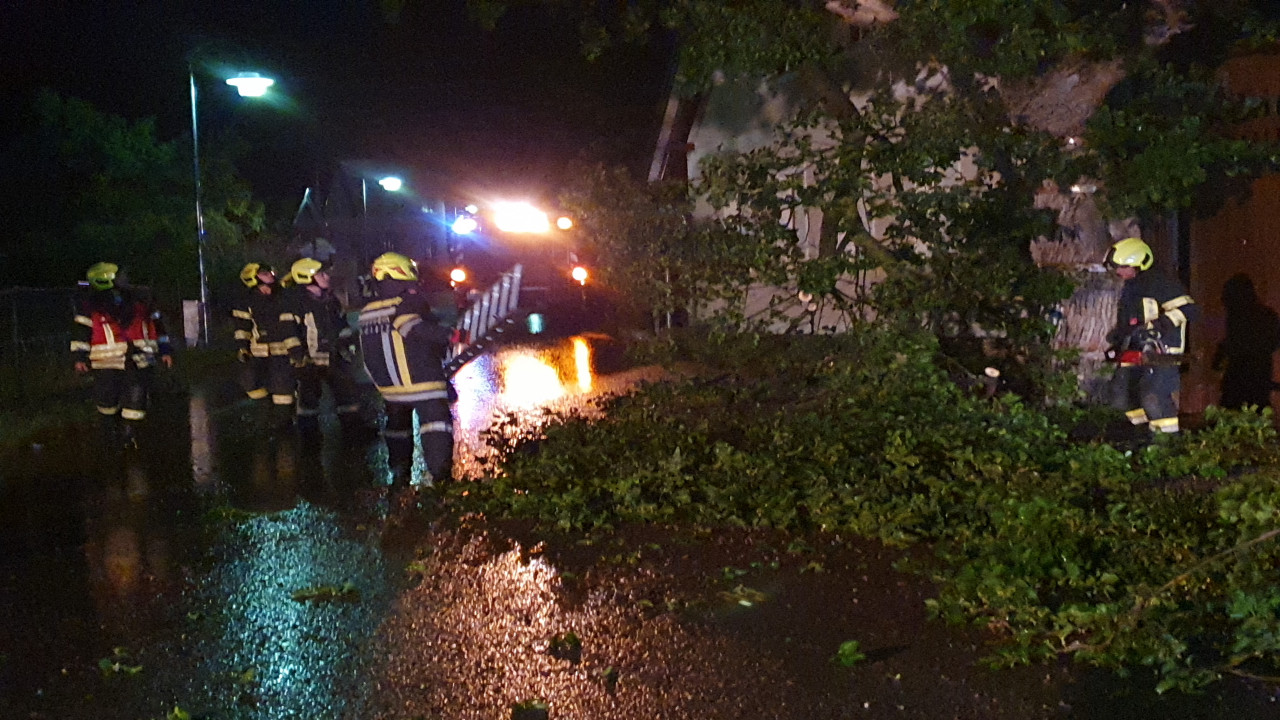 Es befand sich ein großer Ast quer über die Fahrbahn und ein zweiter drohte abzustürzen. Mittels Motorkettensäge konnte die Straße schnell wieder freigeräumt werden.
