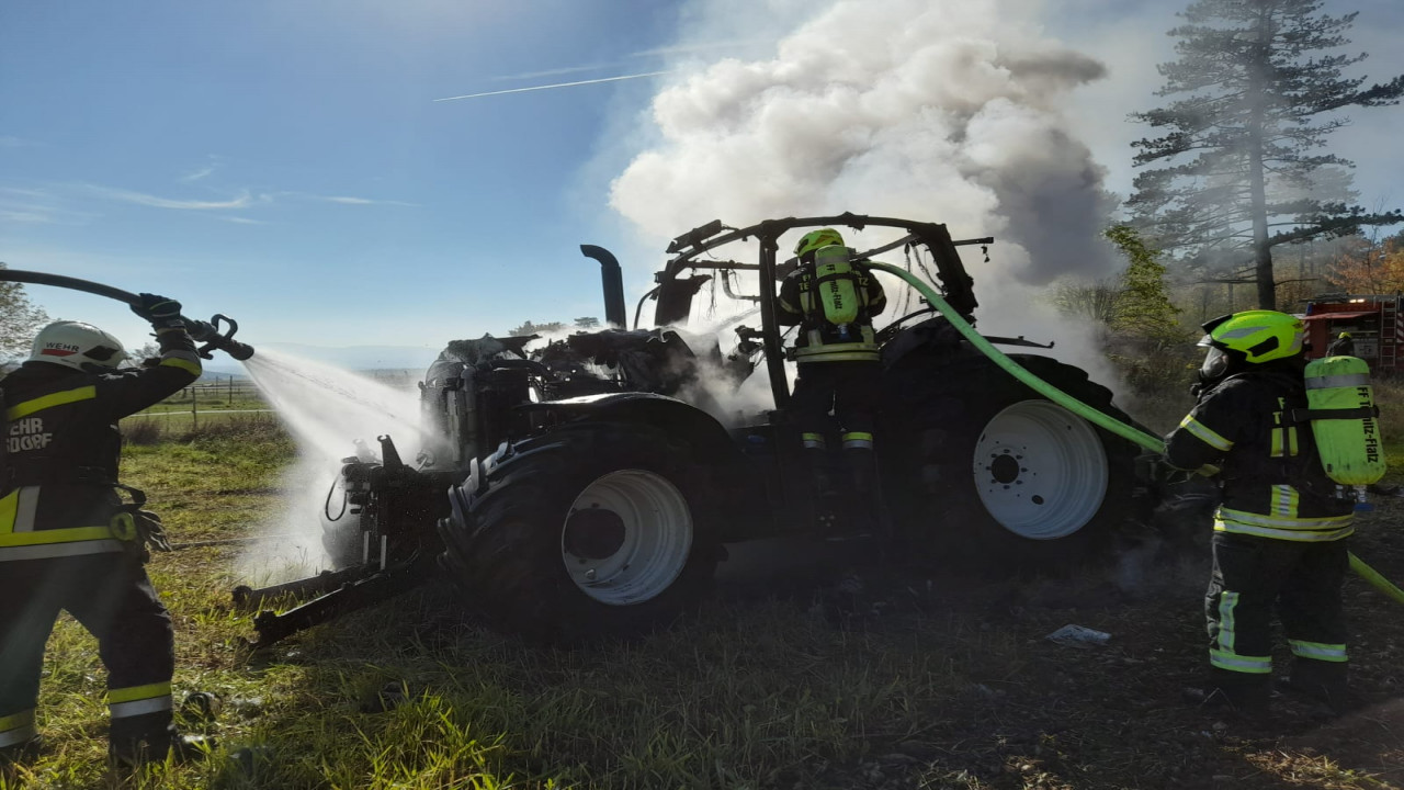 Nachrückende Wehren unterstützen uns bei den Löscharbeiten. Weiters wurde der Traktor sowie die nähere Umgebung mittels Wärmebildkamera der FF Ternitz-Flatz kontrolliert.